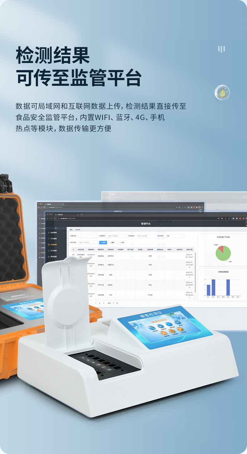 4、仪器带有监管平台,数据可局域网和互联网数据上传,羞羞AV在线播放结果直接传至食品安全监管平台。进行区域食品安全监管及大数据分析处理与数据统计,羞羞AV在线播放区域食品安全长短期动态,达到食品安全问题预估、预警