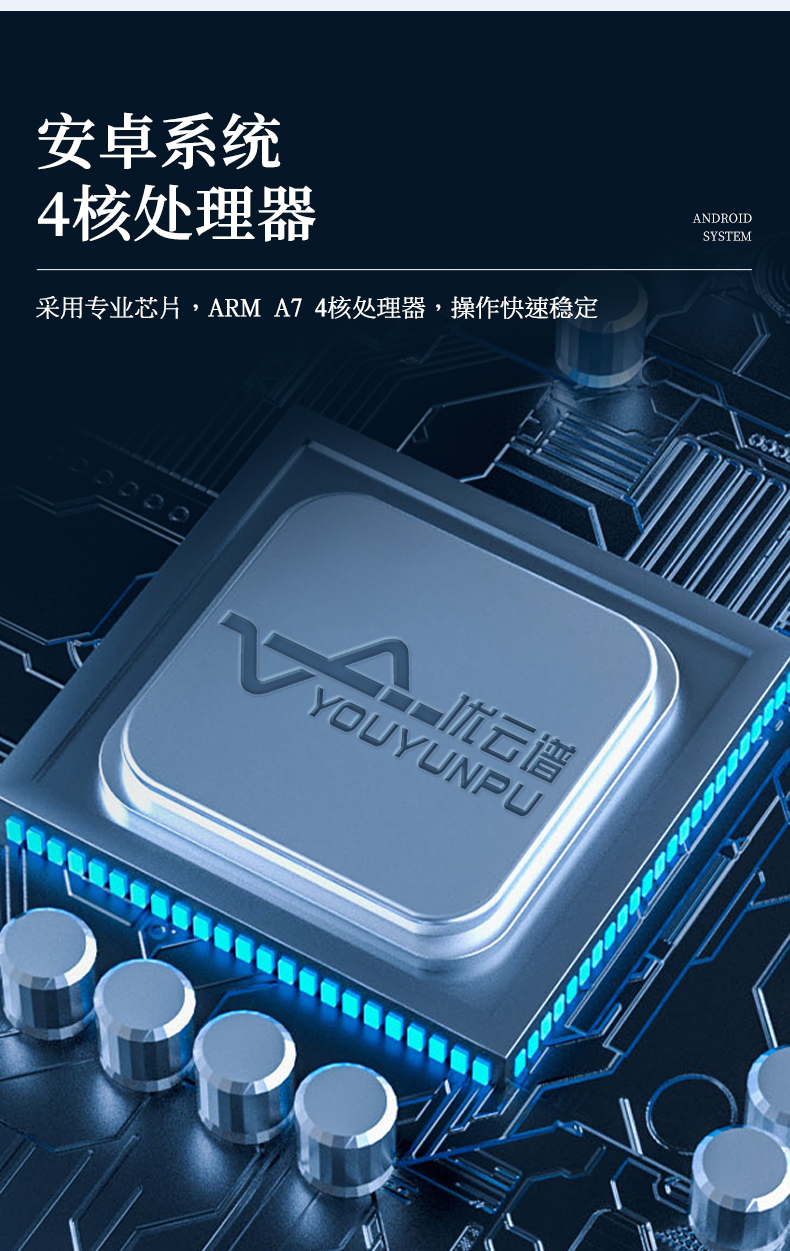 1、主控芯片采用ARM Cortex-A7,RK3288/4核处理器,主频1.88Ghz,运转速度更快速,稳定性更强。